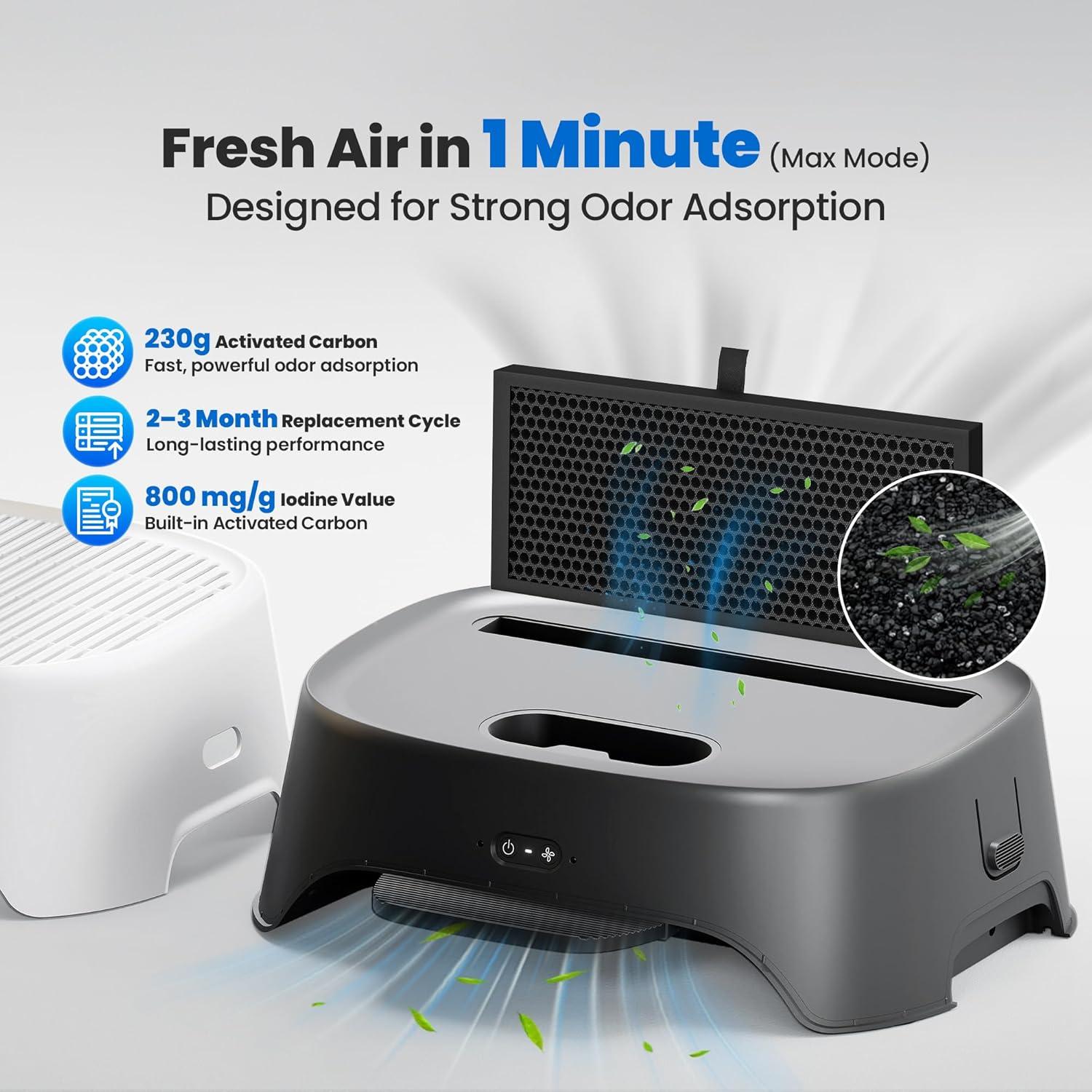 【3 Airflow Modes for Different Needs】Use All-Day mode (green light) for continuous freshness, Boost mode (orange light) for stronger odor control, and Max mode (red light) for 1-minute odor cleanup after cat use.